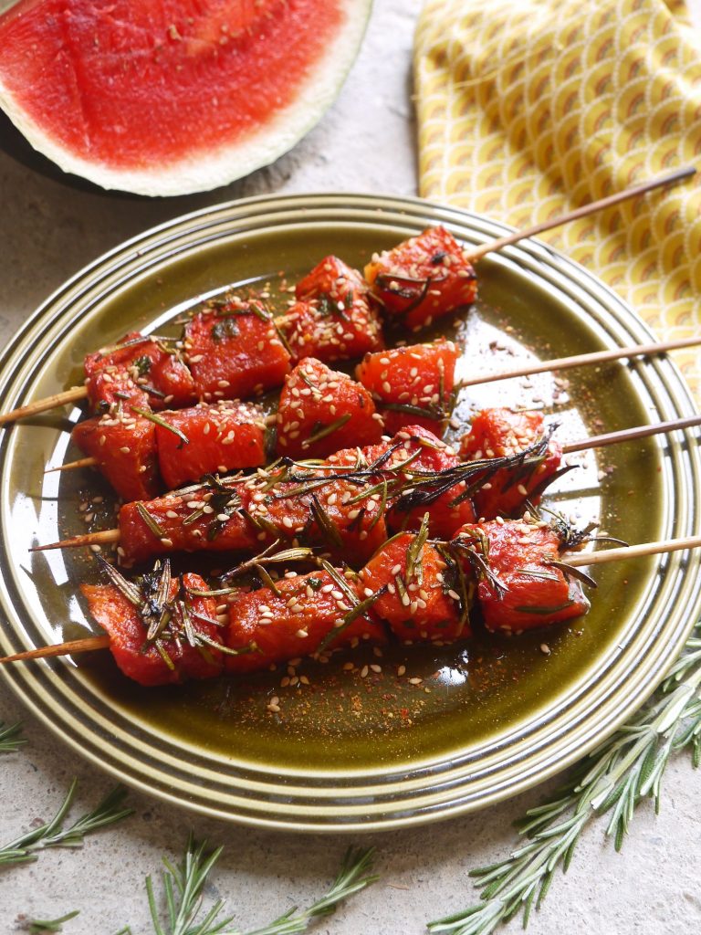 Pour un repas complet, n'hésitez pas à ajouter des dés de tofu fumé entre les cubes de pastèque.