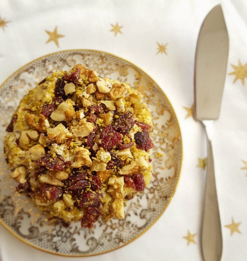 5. Au moment de servir : démoulez le fromage sur une petite assiette ou une planche en bois pour un effet plus rustique, versez le mélange de noix/cranberries/pistache sur le fromage, aidez-vous de vos mains pour le faire adhérer sur toute la surface.