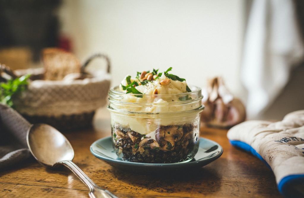 5- Mélangez les lentilles à la préparation des champignons. Ajoutez une cuillère de crème de soja et remuez sur feu doux 2 minutes. Puis ajoutez les pignons. Salez et poivrez. (Gardez quelques pignons et un peu de persil pour décorer le dessus de chaque verrine.)