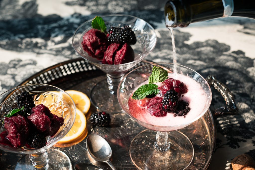 **Arrosez de champagne ou autre vin pétillant pour faire un dessert élégant et original. Si vous êtes végane, faites attention de choisir une bouteille adaptée car tous les vins ne sont pas véganes !