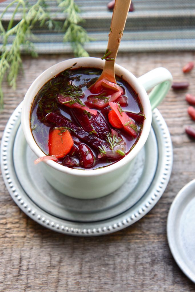 • La soupe de betteraves, "borsch" (différentes écritures sont possibles) en Russie et en Ukraine,  est finalement un bouillon plus ou moins copieusement garni, selon le pays et la cuisinière. Initialement, elle est composée de betteraves certes mais aussi parfois de chou, de haricots et/ou de pommes de terre comme ici auxquels on ajoute volontiers, selon la tradition, de la viande (boeuf ou poulet). Point de chair animale ici mais de délicieux haricots qui pourront être remplacés par un peu de seitan ou même de tofu fumé à défaut.